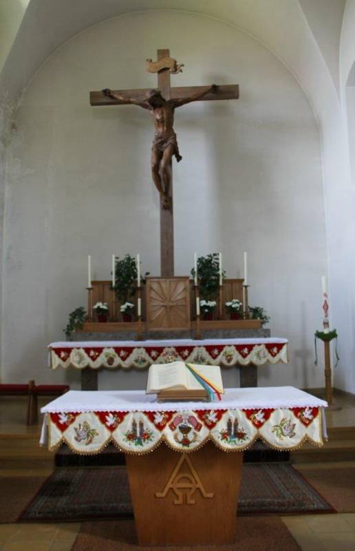 Die nach den Plänen des Münchener Architekten Georg Berlinger aus den „drei heimatlichen Elementen Granit, Holz und Schmiedeeisen“ erbaute Kirche ist bewusst schlicht gehalten. Den Mittelpunkt des Kircheninneren bildet das mächtige Kreuz mit einer 2,10 m hohen Christusfigur.Dieser Christuskörper ist eine getreue Nachbildung des berühmten Bronzechristus in der Niedermünsterkirche von Regensburg aus dem Jahre 1625. Diese Nachbildung wurde eigens für den in Regensburg gedrehten Film „Das ewige Spiel“ geschaffen und diente im Juni 1951 als Katholikentagkreuzbei der Hauptveranstaltung im Jahn Stadion Regensburg. Die anmutige Statue der Gottesmutter mit Kind am Seitenaltar ist ein Werkdes Fichtelberger Bildhauers Max Nickl. Bildhauer Karl Bornschlegel aus Burglengenfeld, der auch als Schöpfer der Werdenfelser Madonna bekannt wurde, schuf den Kreuzweg aus Steinguss. Der Hochaltar ist aus rotem Flossenbürger Granit hergestellt.
